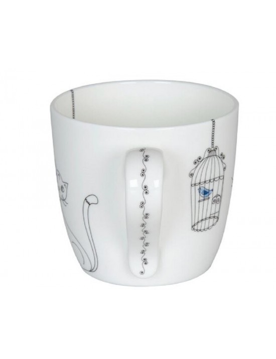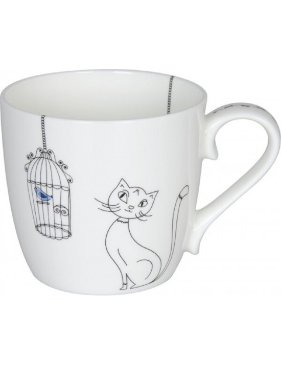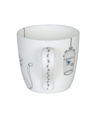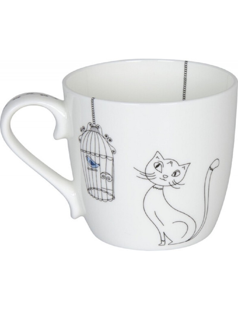 Selon Léonard de Vinci, même le plus petit chat est un chef-d'œuvre. De nombreux amoureux des chats seront d'accord avec lui. Modernité, simplicité et élégance décrivent bien ce mug artistique. Une touche de couleur est apportée par l'oiseau bleu dans sa magnifique cage.