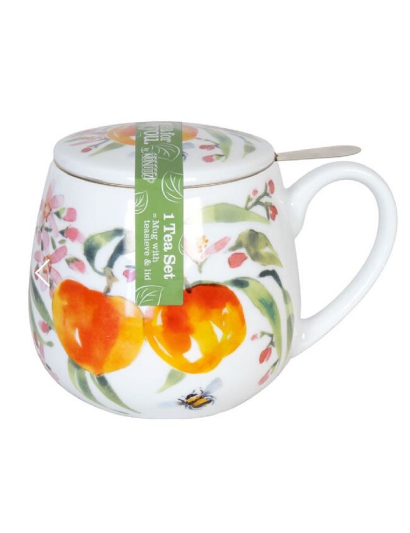Juteuse et sucrée, la pêche est également très appréciée en infusion par les gourmands. Ce mug en porcelaine de haute qualité contient une passoire et un couvercle assorti qui garde votre boisson préférée au chaud pendant longtemps. Le motif montre une belle illustration de pêches dans un style aquarelle, entourées de fleurs colorées et de jolies abeilles occupées à faire leur travail.