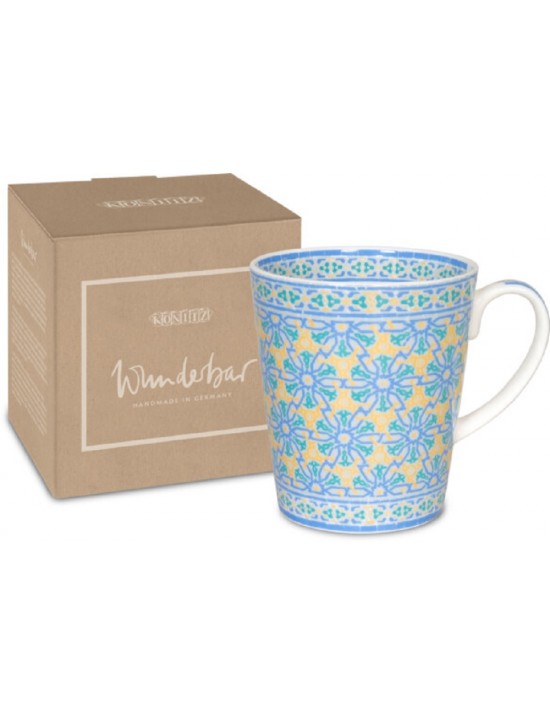 Même à l'âge de pierre, des récipients en céramique décorés d'ornements étaient déjà utilisés. Un bel arrangement de motifs floraux et géométriques décore cette tasse Wunderbar fabriquée par Könitz Porcelain. Ses formes abstraites se répètent dans toute la tasse et créent un design symétrique. La combinaison de bleu vif, de turquoise et de jaune fait de cette tasse un véritable accroche-regard.