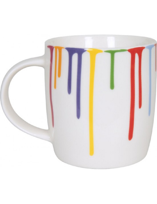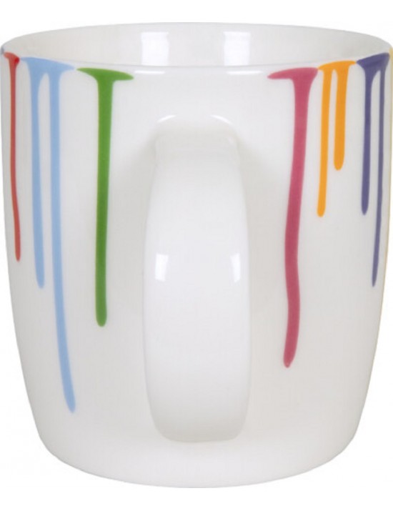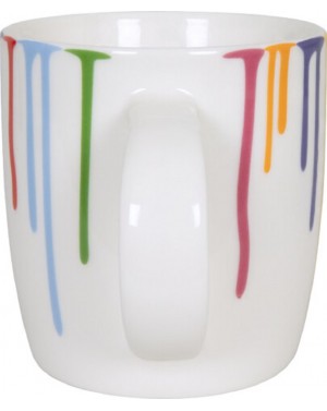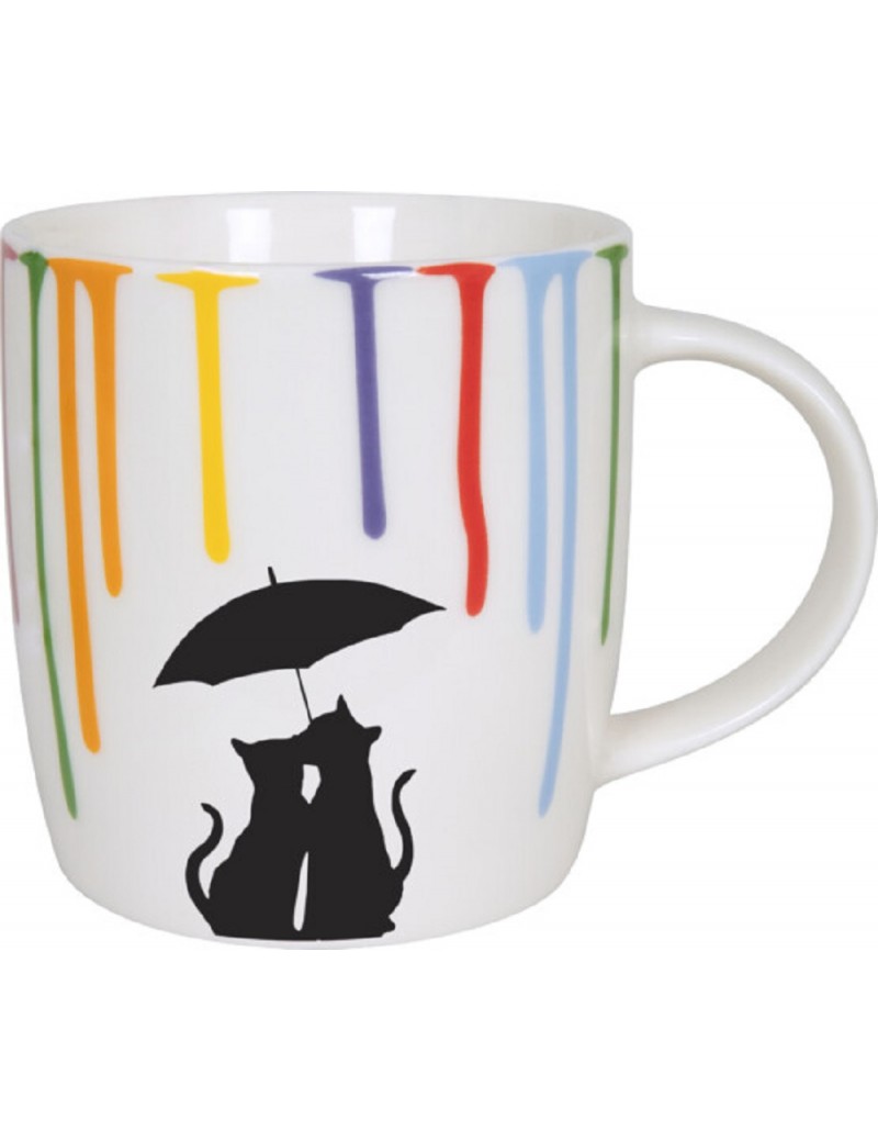 Ce n'est pas de l'eau qui coule sur notre parapluie, mais plutôt des éclaboussures de couleur. Elles font de la tasse un accroche-regard spécial, dans des couleurs arc-en-ciel fortes et lumineuses. Contrairement à ces couleurs, les animaux sont représentés en noir et blanc sous le parapluie. Un mélange fort et élégant.