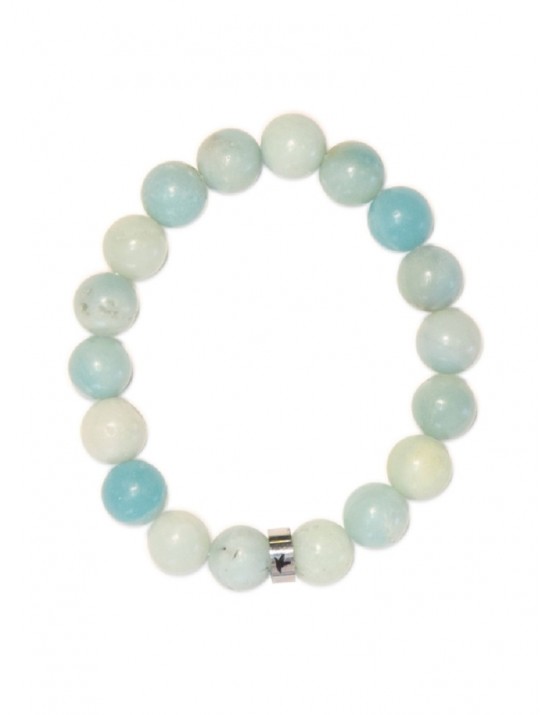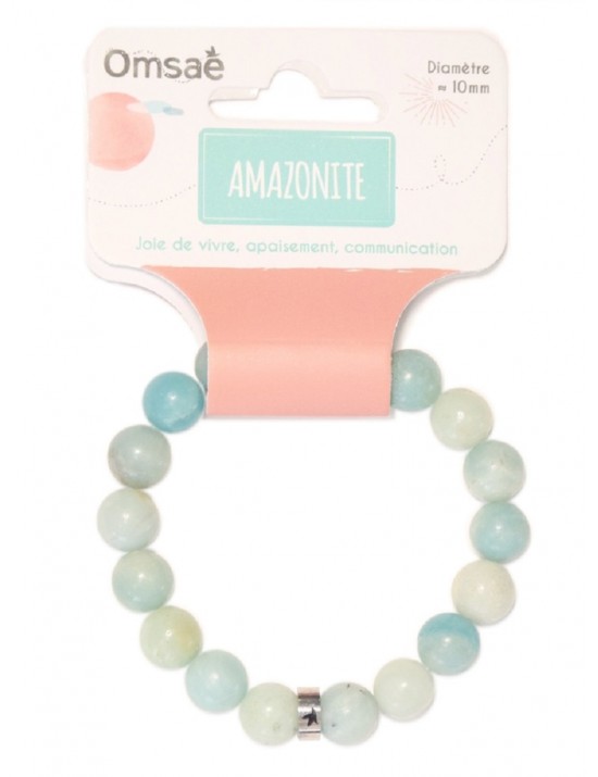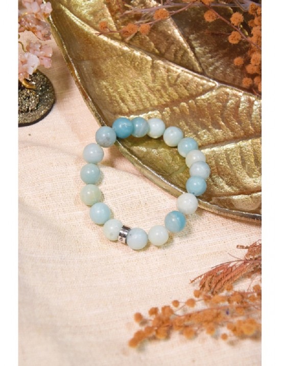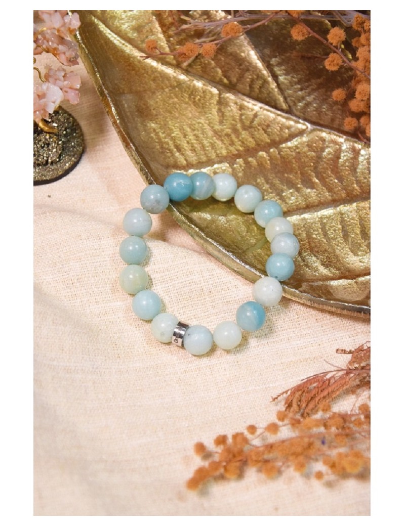 Bracelet élastique composé de perles en pierre naturelle d'amazonite. Cette pierre permet d'éveiller sa joie de vivre. Sélectionnée pour ses vertus apaisantes, elle aide à relativiser et permet de vivre l’instant présent spontanément.
