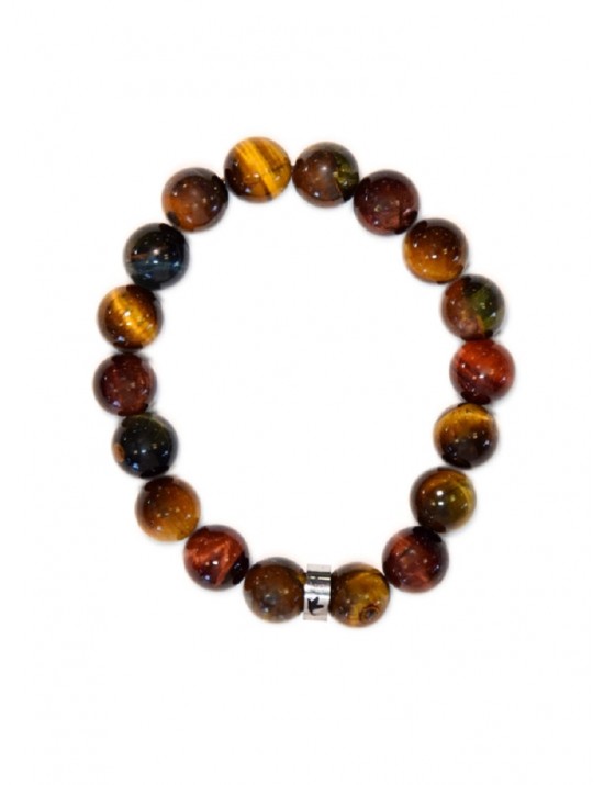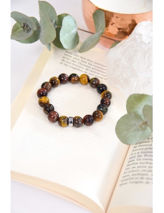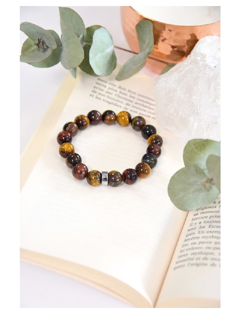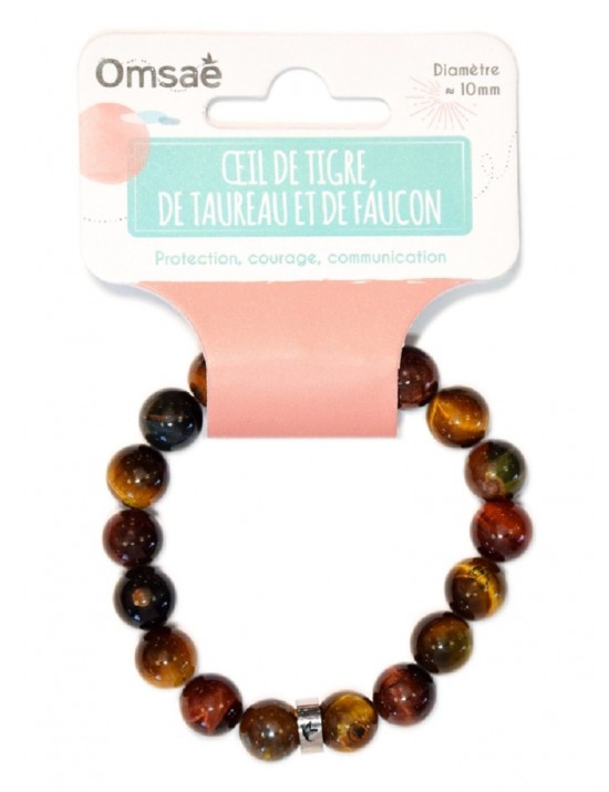 Bracelet élastique composé de perles en pierre naturelle d'œil de tigre, taureau et faucon. Véritables pierres de protection, l'œil de tigre et l'oeil de taureau renvoient les énergies négatives et donnent courage et confiance en soi. L'œil de faucon favorise la communication, l'ouverture aux autres et au changement.