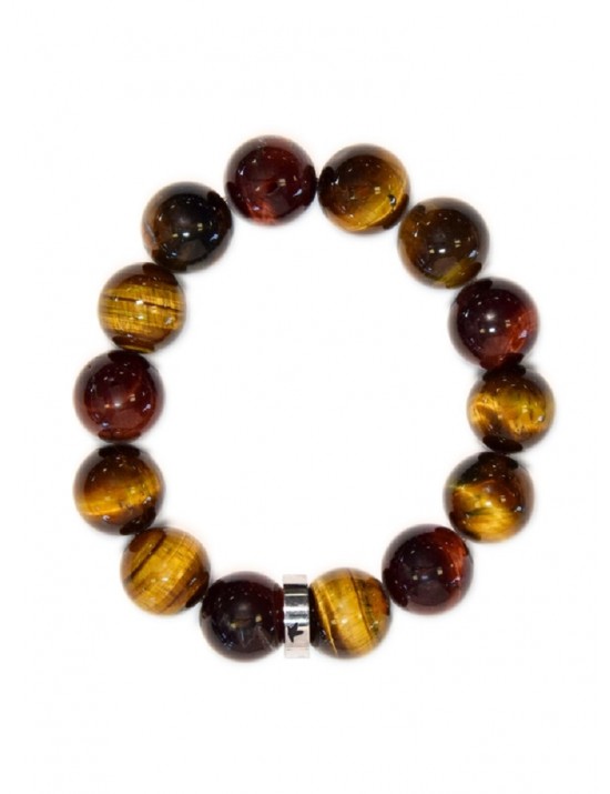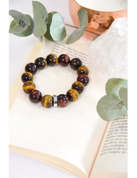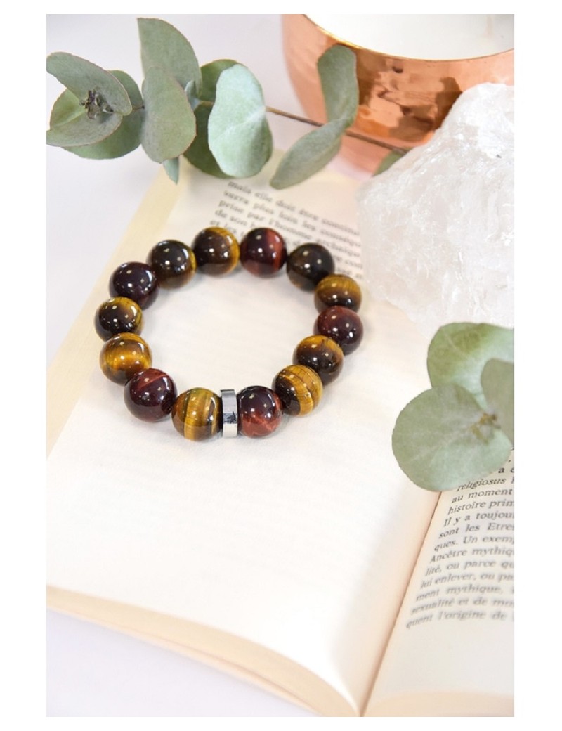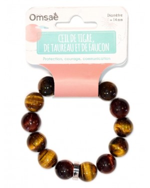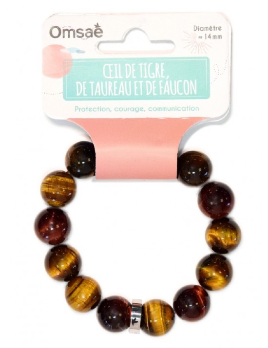 Bracelet élastique composé de perles en pierre naturelle d'œil de tigre, taureau et faucon. Véritables pierres de protection, l'œil de tigre et l'œil de taureau renvoient les énergies négatives et donnent courage et confiance en soi. L'œil de faucon favorise la communication, l'ouverture aux autres et au changement.