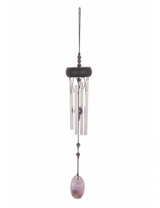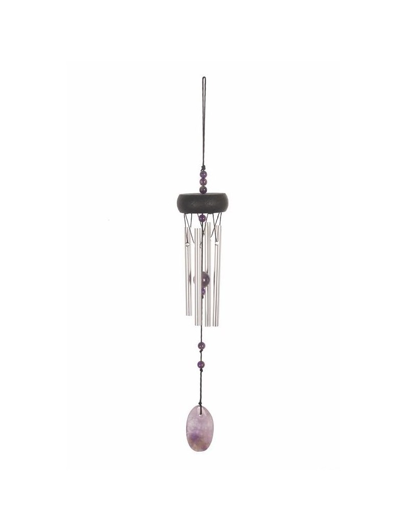 Carillon à vent avec 4 tubes. Perles, partie centrale et basse en pierre naturelle d'améthyste. Tubes en aluminium sur support rond noir en bois de frêne. Cordes en nylon. Dimensions : 4 x 4 x 33 cm. Utilisation en intérieur et en extérieur.