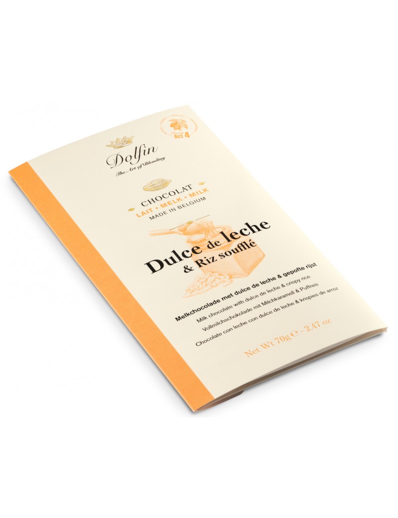 Le Dulce de leche ou « confiture de lait », voluptueux mélange de lait et de sucre cuit à feu très doux, apporte son plein de douceur au chocolat au lait. Le riz soufflé croustillant révèle ensuite tendrement le duo.