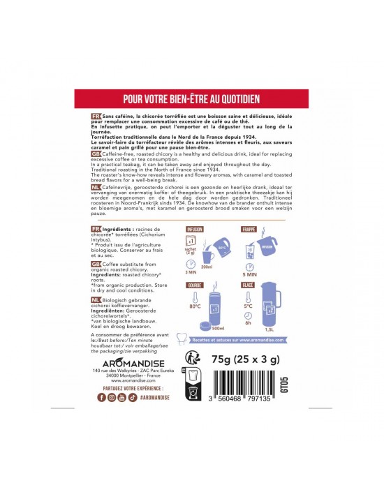 Sans caféine, notre chicorée torréfiée en infusettes est parfaite pour réaliser une boisson saine et délicieuse, idéale pour remplacer une consommation excessive de café ou de thé au quotidien.