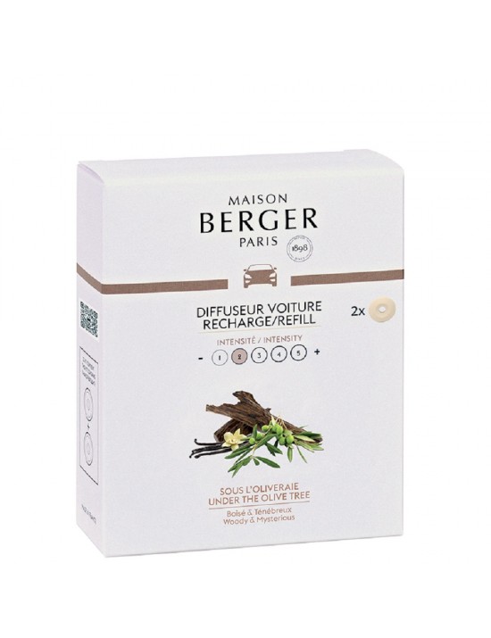 Les Recharges Diffuseur voiture Sous l’Oliveraie délivrent un parfum boisé et ténébreux. Les senteurs facettées du bois de oud se conjuguent aux notes ambrées et chaleureuses de myrrhe. Séduction et sensualité émanent de ces accords parfumés, soulignés par une pointe raffinée florale de jasmin. En son cœur, vous retrouvez l’essence subtile du cuir, qui donne tout son caractère à la composition et s’épanouit sur un camaïeu d’odeurs naturelles et boisées telles que le bois d’olivier, le cèdre et le patchouli. Pour parachever cette fragrance riche et complexe, un lit de velours vanillé vous attend permettant au musc de venir délicieusement vous envelopper. Derrière votre volant, souffle comme un air de Méditerranée Orientale. D’une intensité modérée de 2 sur 5, ces Recharges Diffuseur voiture Sous l’Oliveraie se veulent chaleureuses et peu entêtantes. Deux céramiques parfumées sont comprises dans le pack, il suffit de les associer à un des diffuseurs voiture Maison Berger Paris pour en profiter !