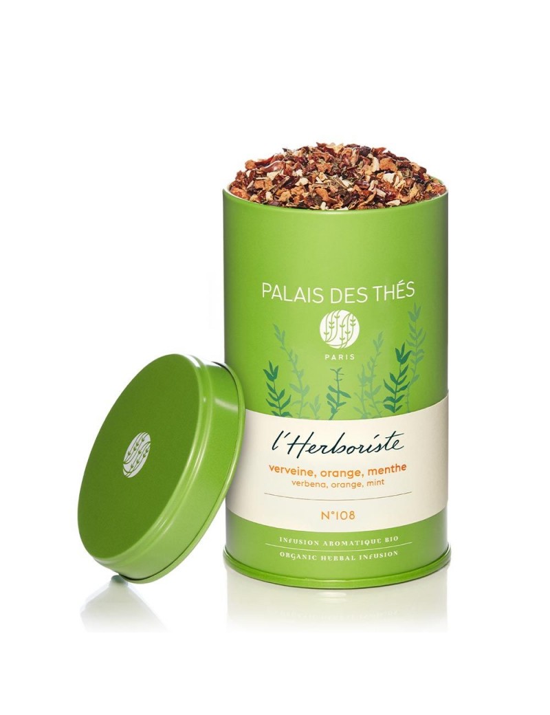 L'Herboriste N°108 - verveine, orange, menthe - est une infusion BIO, subtile et rafraîchissante, très appréciée pour ses vertus relaxantes et apaisantes. Les notes douces de la verveine accordées à la pointe de fraîcheur de l’orange et de la menthe, créent un équilibre délicat et apaisant.