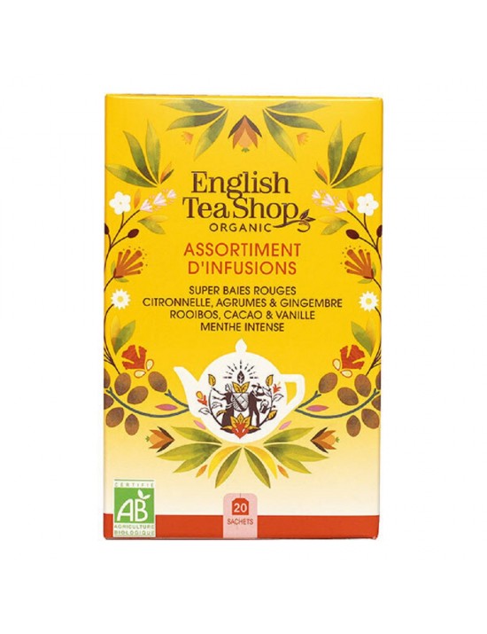 Assortiment de 4 tisanes bio : "Super baies rouges", "Rooibos, cacao & vanille", "Citronnelle, agrumes & gingembre" et "Menthe intense". Tout le raffinement des mélange English Tea Shop dans ce coffret de 4 infusions bio. Packaging écoconçu.