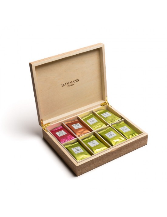 Magnifique coffret en bois clair contenant 48 sachets enveloppés d'infusions assorties: