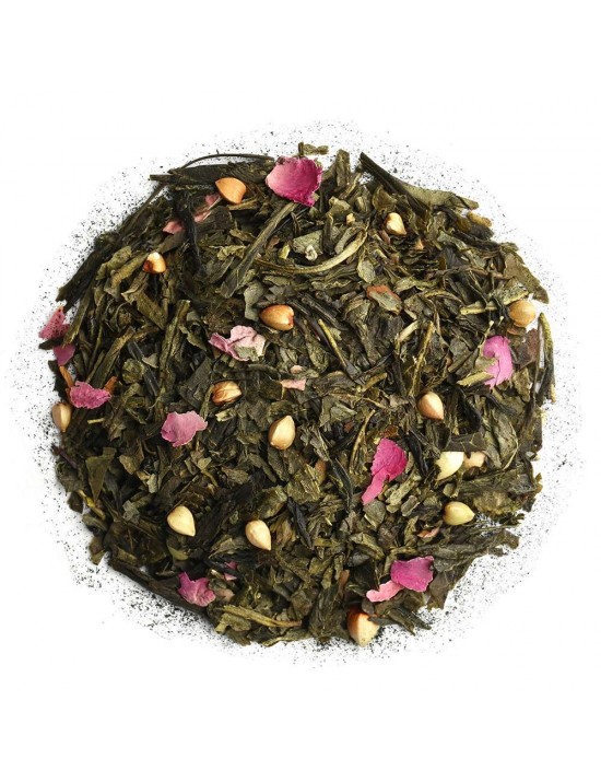 Thé vert Sencha* (Japon, Chine) (75%), sarrasin* (15%), arôme naturel poire (5%), spiruline* (3%), pétales de rose*.
