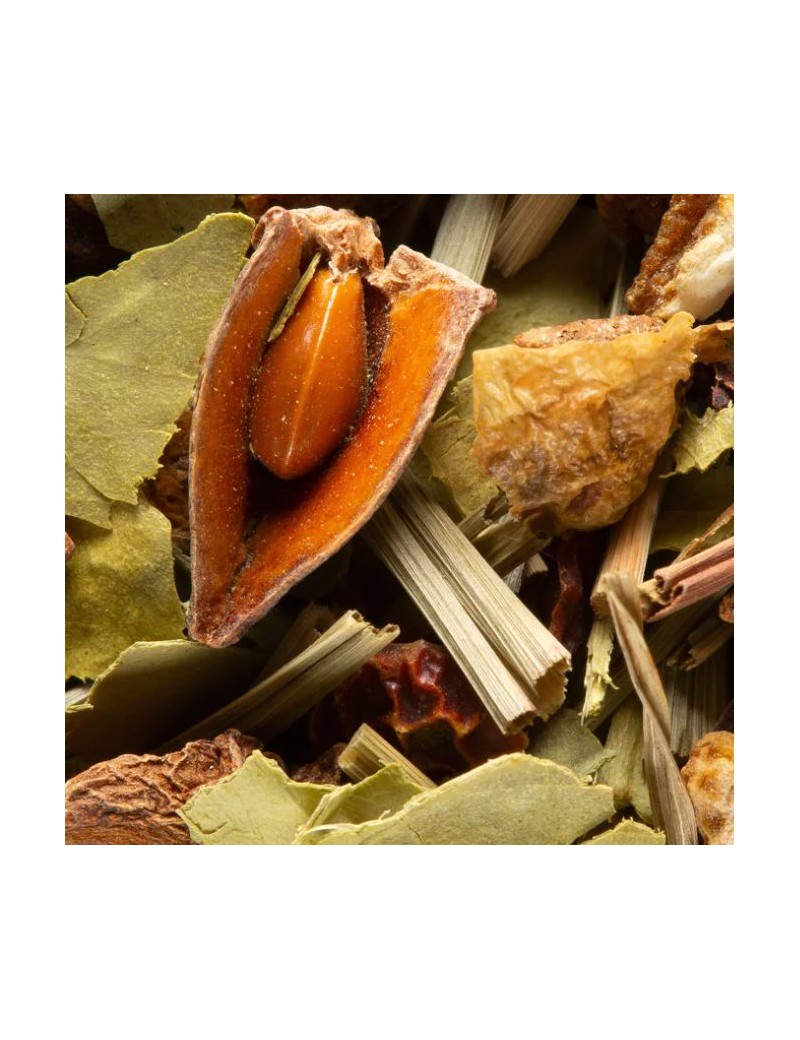 Citronnelle, badiane et cynorrhodon sont ici audacieusement associés dans une infusion aux parfums frais, vifs et fruités du citron et de la clémentine. Mêlé également à la note douce et boisée de la vanille, cette infusion délivre une tasse ronde et délicieusement sucrée évoquant une friandise de sucre cuit.