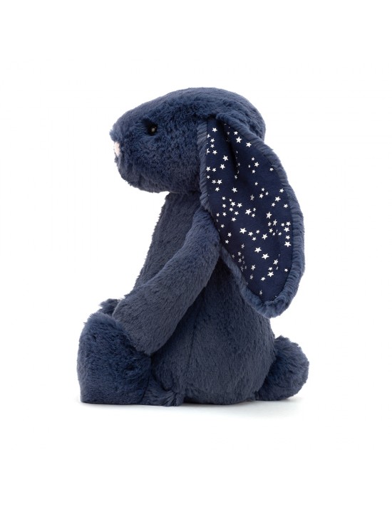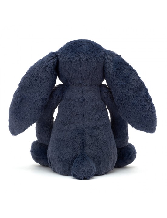 Un lapin tout doux de la marque Jellycat, avec une fourrure bleu nuit et des oreilles scintillantes.