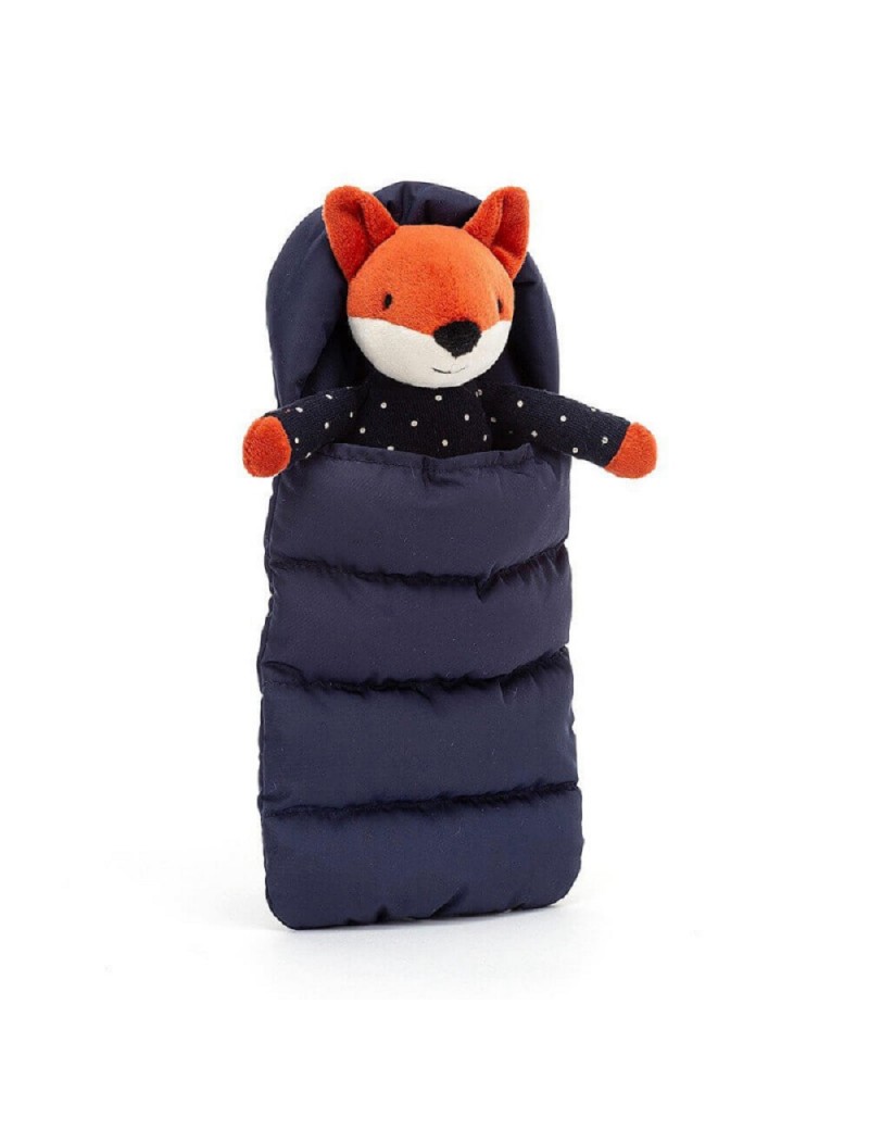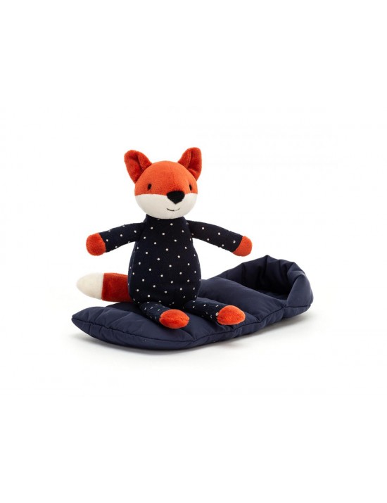 Confortablement installé dans son sac de couchage, ce petit renard porte un joli pyjama bleu marine à pois blancs.