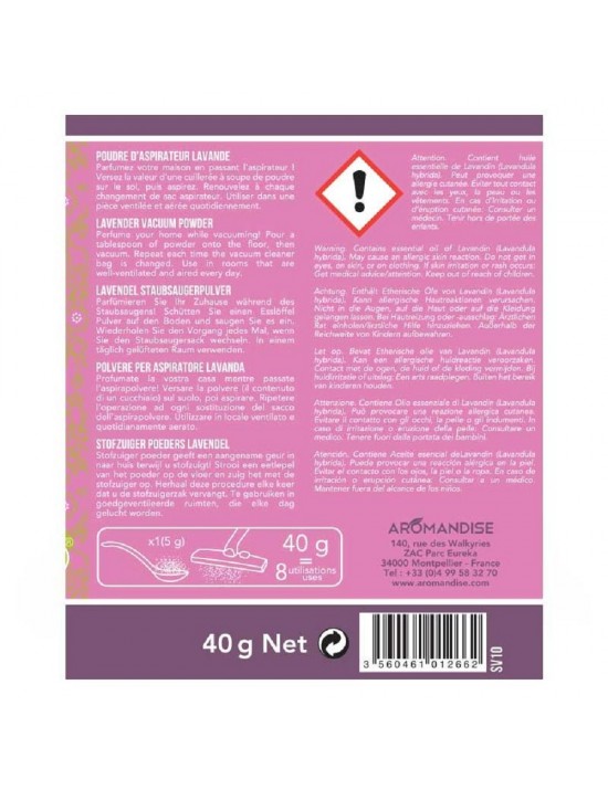 La Poudre d'Aspirateur Lavande va diffuser un tourbillon de senteurs légères mais persistantes, dès la mise en fonction de l'aspirateur. Elle rafraîchit et parfume durablement votre intérieur après le passage de l'aspirateur ! Cette fragrance 100% naturelle est extraite de plantes.