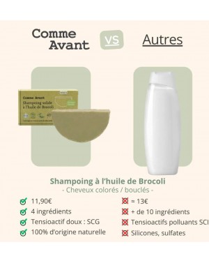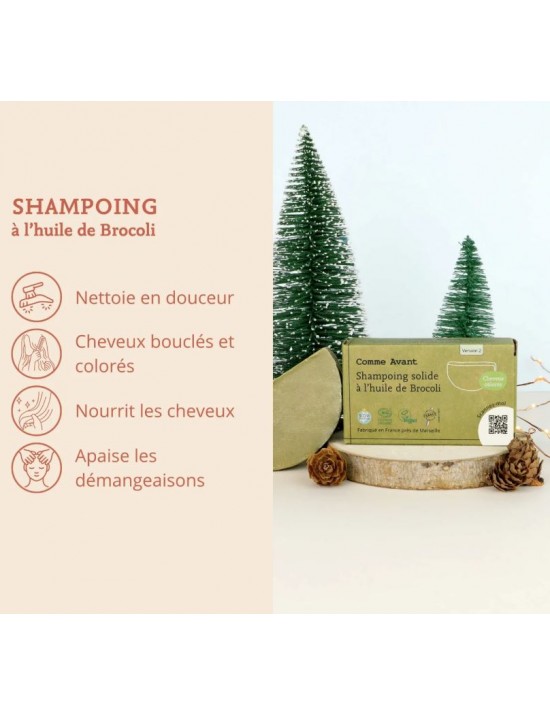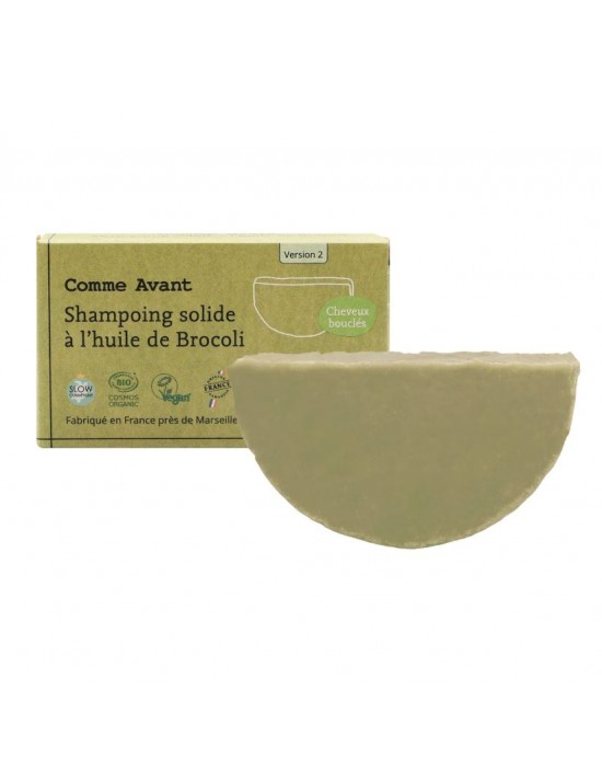 Le Shampoing Solide à l'Huile de Brocoli Bio - Cheveux Bouclés - Comme Avant nettoie en douceur tout en préservant l'éclat des cheveux colorés, bouclés ou fragilisés.