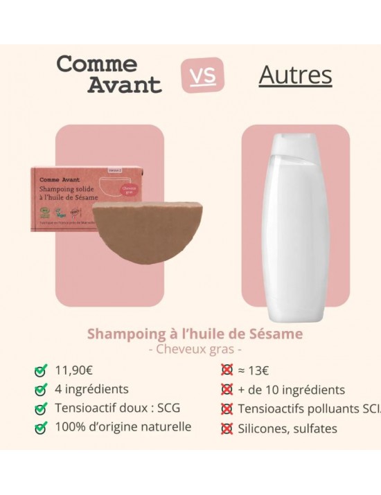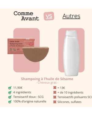 Découvrez le Shampoing Solide à l'Huile de Sésame Bio - Cheveux Gras - Comme Avant, une solution naturelle et efficace pour réguler l'excès de sébum.
