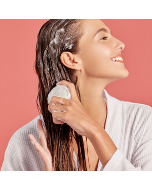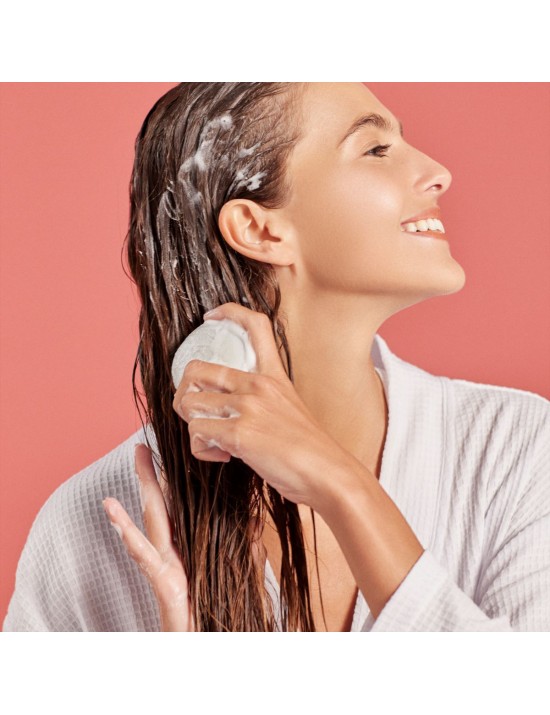 Humidifier le shampoing solide puis le faire mousser dans les mains ou directement sur cheveux mouillés afin d’obtenir une mousse généreuse. Masser le cuir chevelu puis rincer le shampoing.