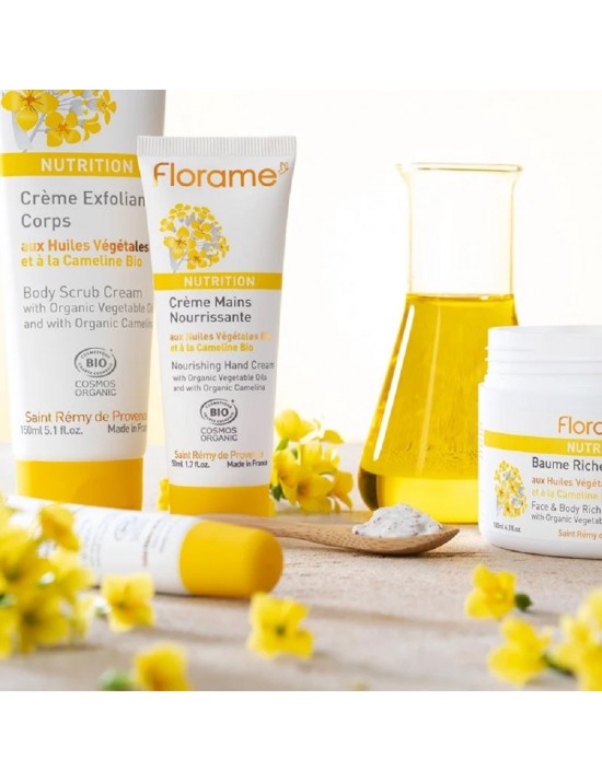 La gamme NUTRITION Florame offre les soins indispensables pour les peaux sèches et sensibles. Sa synergie d'huiles végétales bio d'Onagre et Calendula, riches en acides gras, régénère et assouplit l'épiderme tout en le protégeant contre la déshydratation. Les actions protectrice et apaisante du lait de Cameline biologique sélectionné par la recherche Florame, renforcent l'efficacité de ces soins.