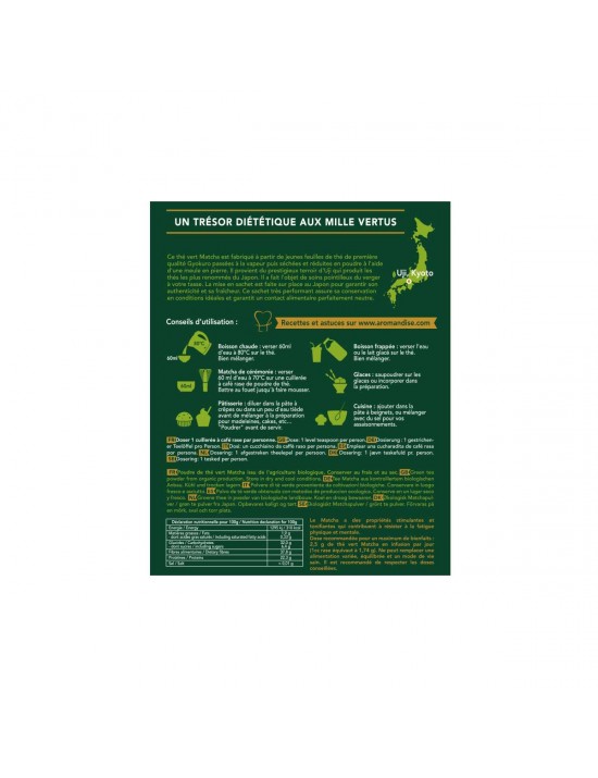 Il provient du prestigieux terroir d'Uji qui produit les thés les plus renommés du Japon. Il a fait l'objet de soins pointilleux du verger à votre tasse. La mise en sachet est faite sur place au Japon pour garantir son authenticité et sa fraîcheur. Ce sachet très performant assure sa conservation en conditions idéales et garantit un contact alimentaire parfaitement neutre.