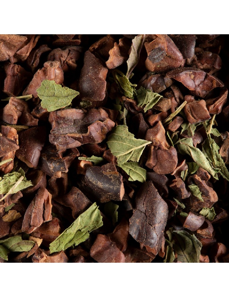 Des éclats de fèves de cacao de Madagascar à la saveur chocolatée finement acidulée et délicatement fruitée se mêlent à de la menthe poivrée. Une alliance parfaite qui combine à la dégustation, la puissance chocolatée de la fève à la saveur végétale et poivrée d’une menthe très aromatique. Le grué de cacao avec sa saveur gourmande s’unit merveilleusement à la menthe sans la perturber dans une infusion à la texture ronde et à l’agréable fini doux et frais persistant.