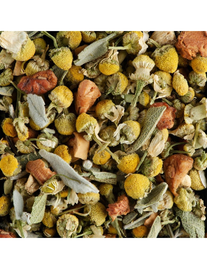 Deux merveilleuses plantes associées dans une infusion qui mêle subtilement les notes fruitées et miellées de la camomille à la saveur finement camphrée et épicée de la sauge. Une infusion étonnante et originale à la fois fraîche et corsée.